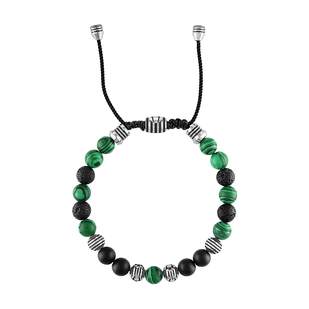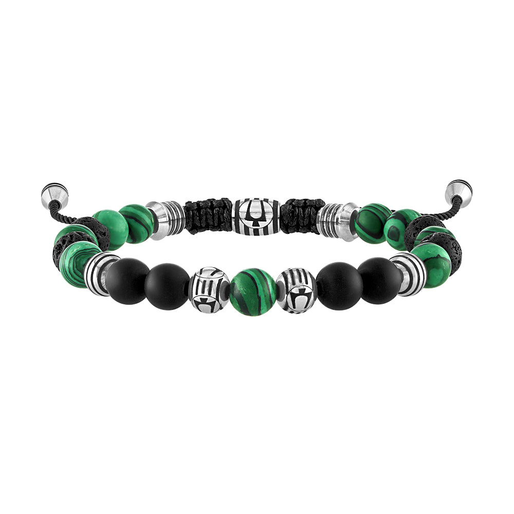 An adjustable beaded bolo bracelet features malachite, a stone of transformation, luck and prosperity, and semi-precious matte black onyx, a stone of protection and stamina. Includes black lava beads, reputed to impart calmness and strength, and accented with striped stainless steel beads featuring the Bulova tuning fork logo. Black cord with an etched logo sliding clasp adjusts easily for a comfortable fit. 8MM beads.