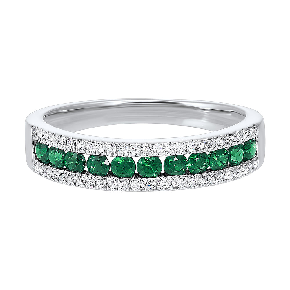 14kt yellow gold ring lined with alternating round diamonds and emeralds. (D 1/7 carat total weight, E 1/5 carat total weight)