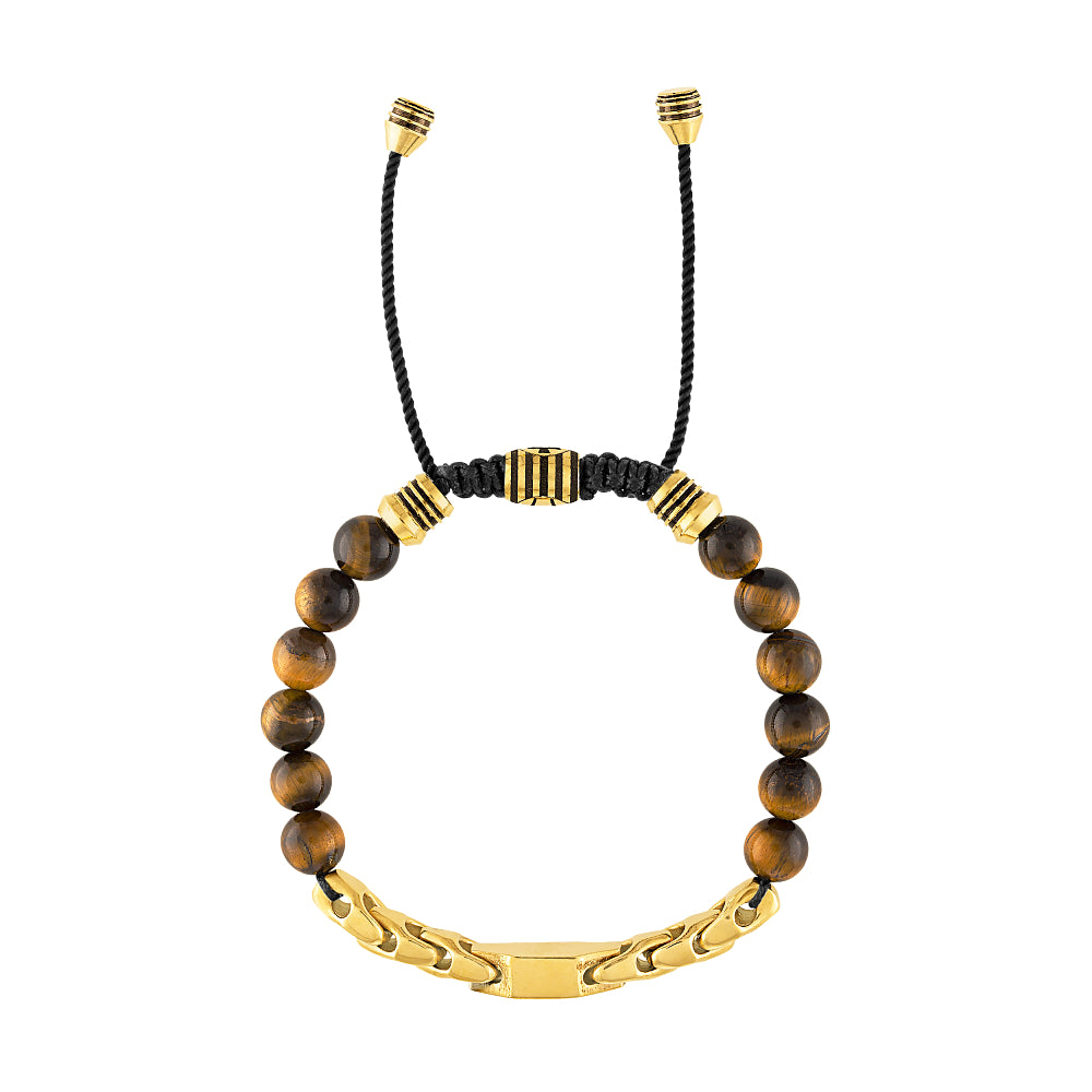 An adjustable beaded bolo bracelet features a center motif of faceted black spinel, a rare gemstone believed to repel negativity while providing inspiration and empowerment. Surrounded by beads of tiger's eye representing power, fearlessness and courage. The tuning fork shaped Bulova Link in front and decorative striped accent beads in back, both in gold-tone stainless steel. Black cord with an etched logo sliding clasp adjusts easily for a comfortable fit. 8MM beads.