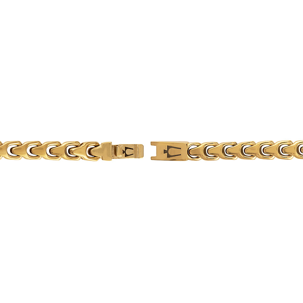 Destined to become a classic, the exclusive Bulova Link™ Collection proudly features our historic tuning fork as its signature design element. This sleek 6MM bracelet in gold-tone stainless steel is perfect as a stand-alone or layering piece. Features a box lock clasp etched with Bulova's iconic logo. Measures 7.25"" in length.