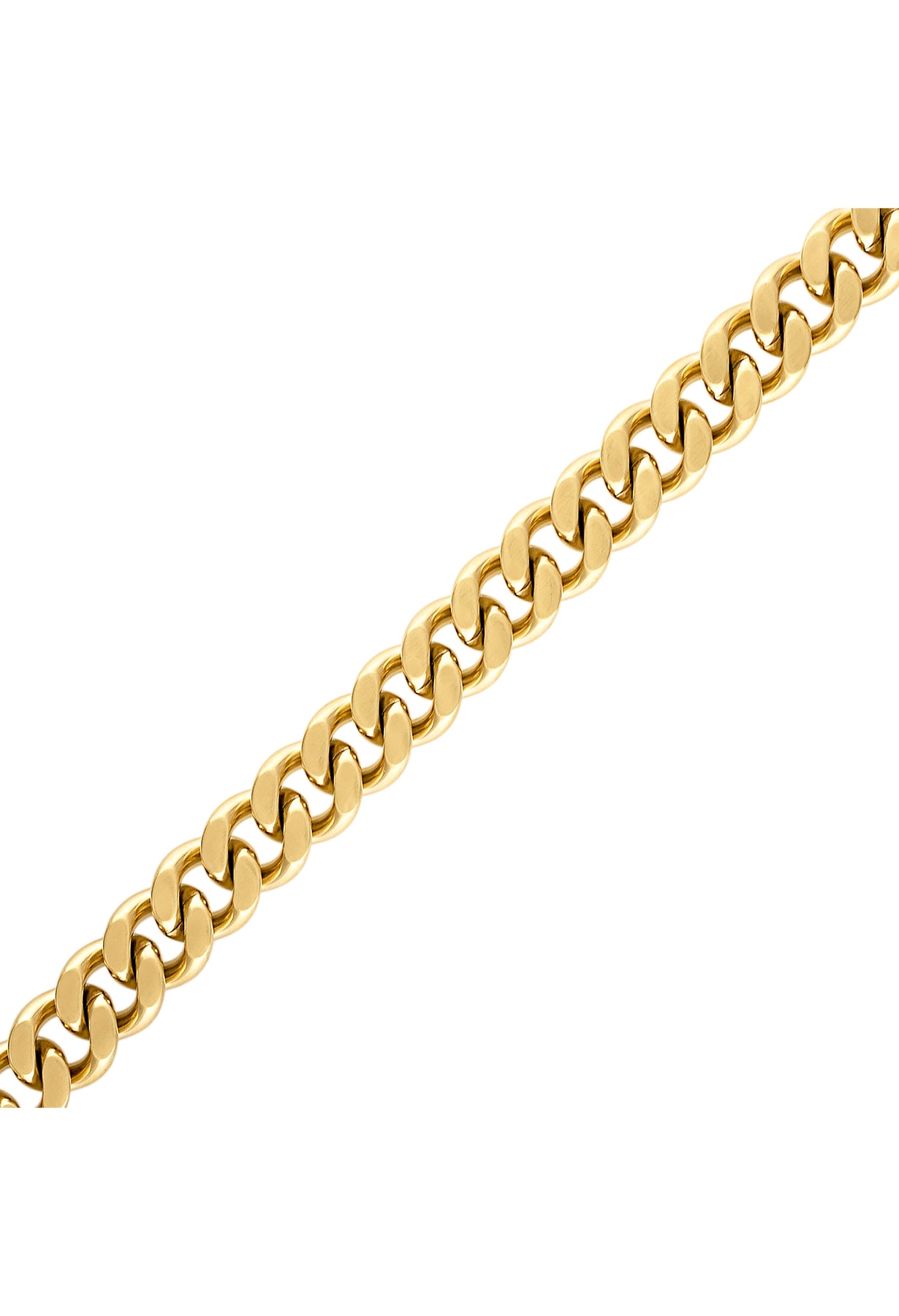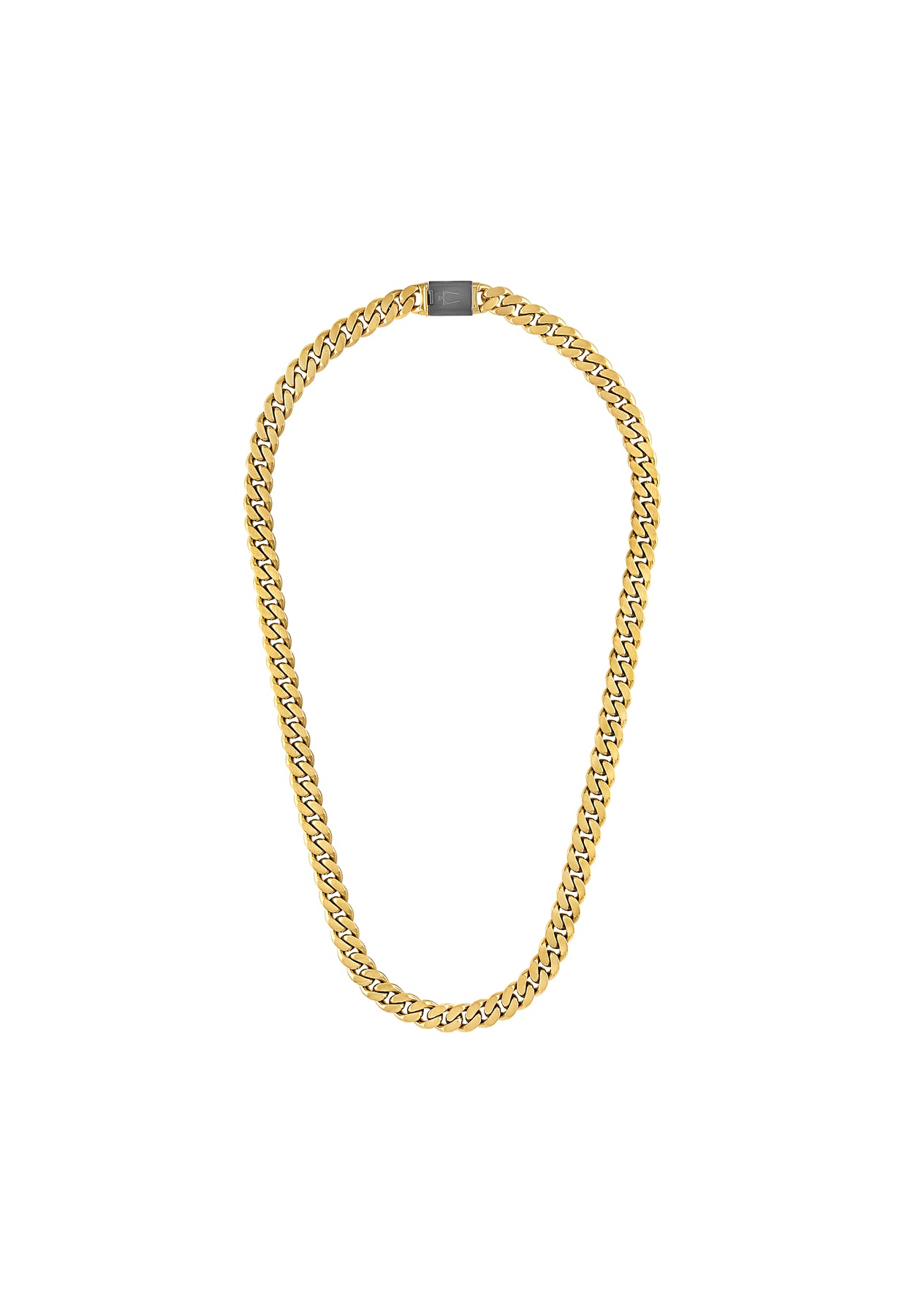 Timeless Bulova curb chain featuring dual-surfaced links in a refined gold color. Classic necklace made of 6MM gold-tone stainless steel combines both polished and brushed finishes. In an eye-catching black color, the custom-designed clasp with tongue in the shape of the Bulova signature tuning fork is subtly branded with our iconic logo. Measures 22"" in length.