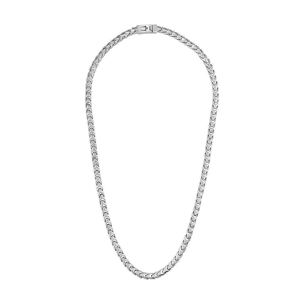The fresh new Bulova Signature Link Collection abounds in both personality and presence. Capturing the essence of our historic tuning fork symbol, this 8MM stainless steel chain measures 24"" in length and features a clasp closure etched with our iconic logo.