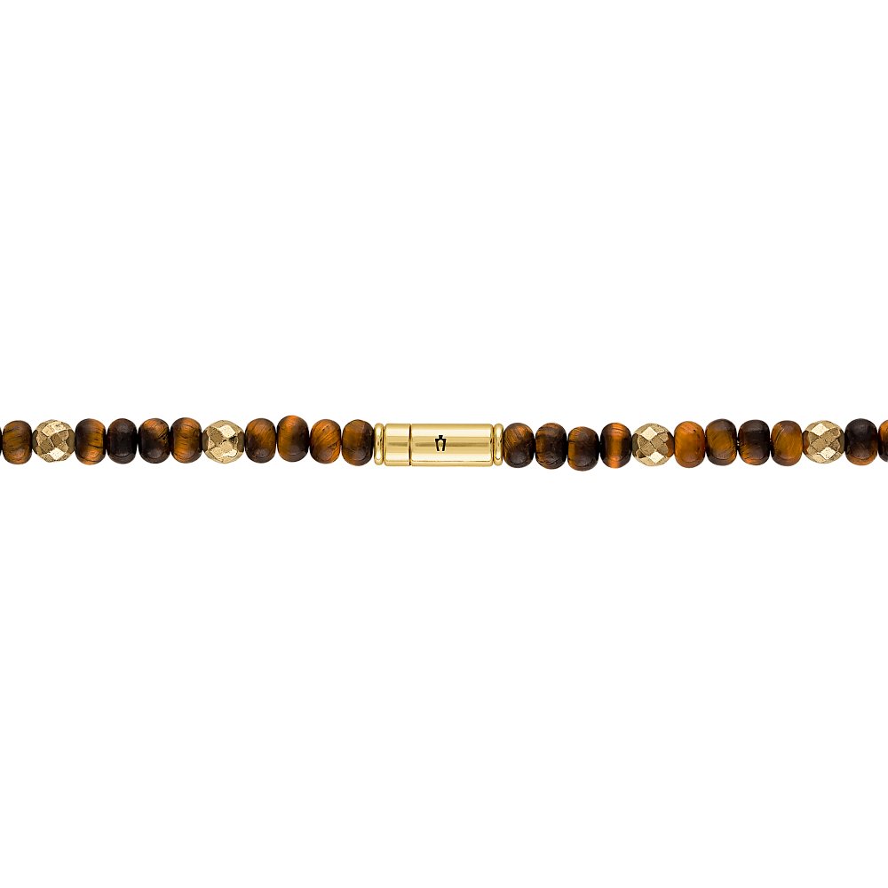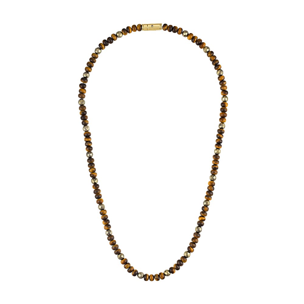 Beaded necklace 22"" in length made of tiger's eye, a highly motivational gemstone representing power, fearlessness and courage. Accented throughout with faceted pyrite beads and crafted with a magnetic cylinder clasp in 14K gold-plated sterling silver etched with iconic tuning fork logo.