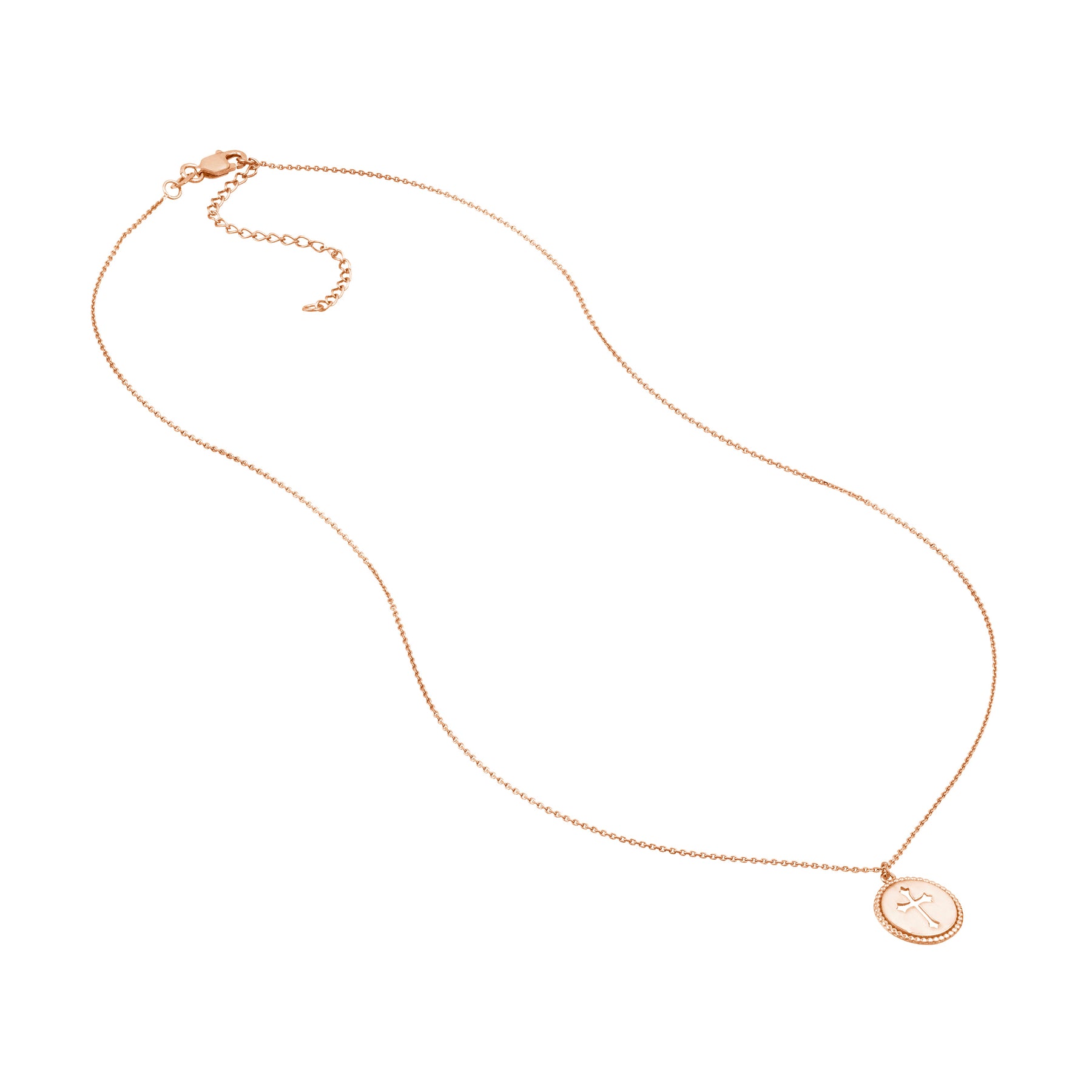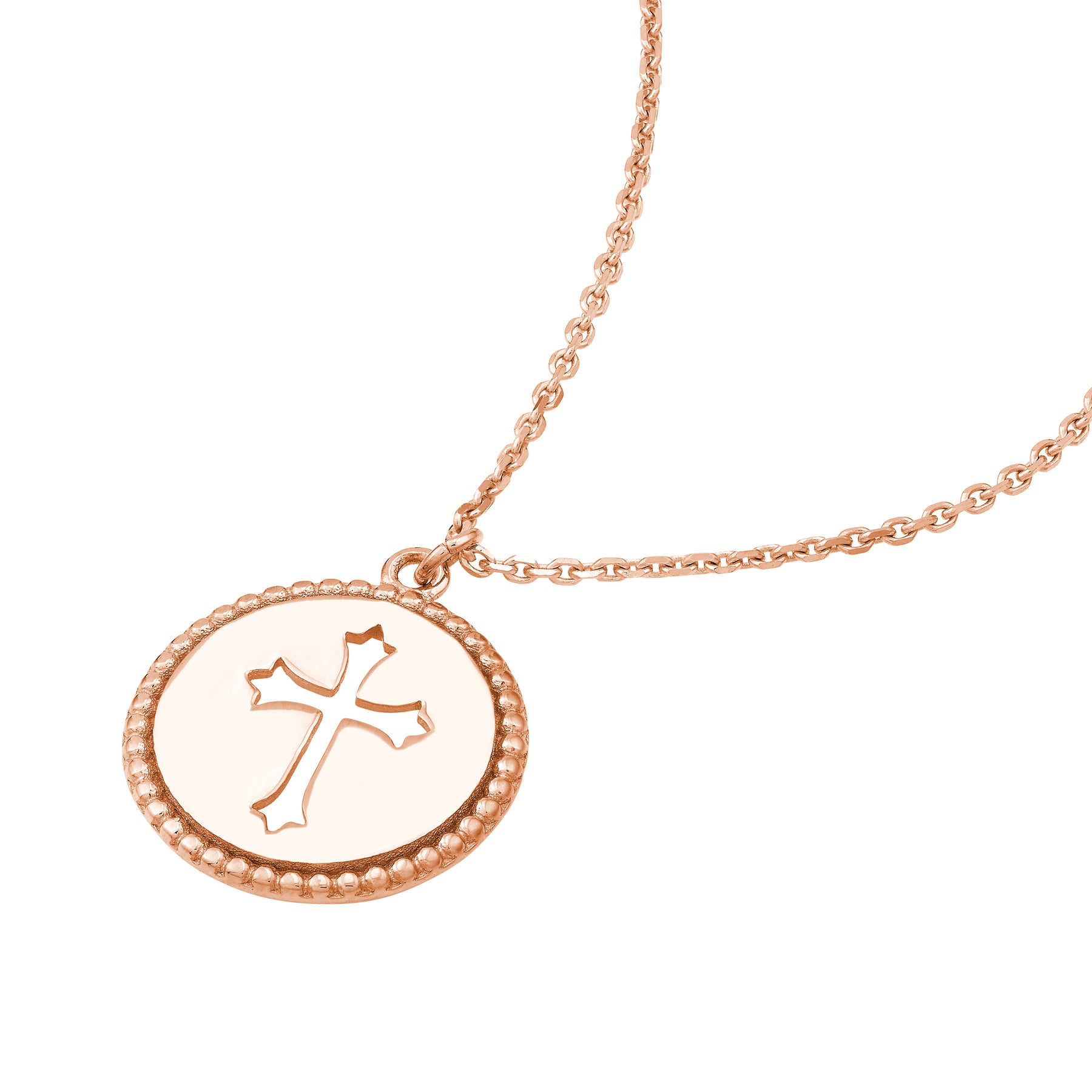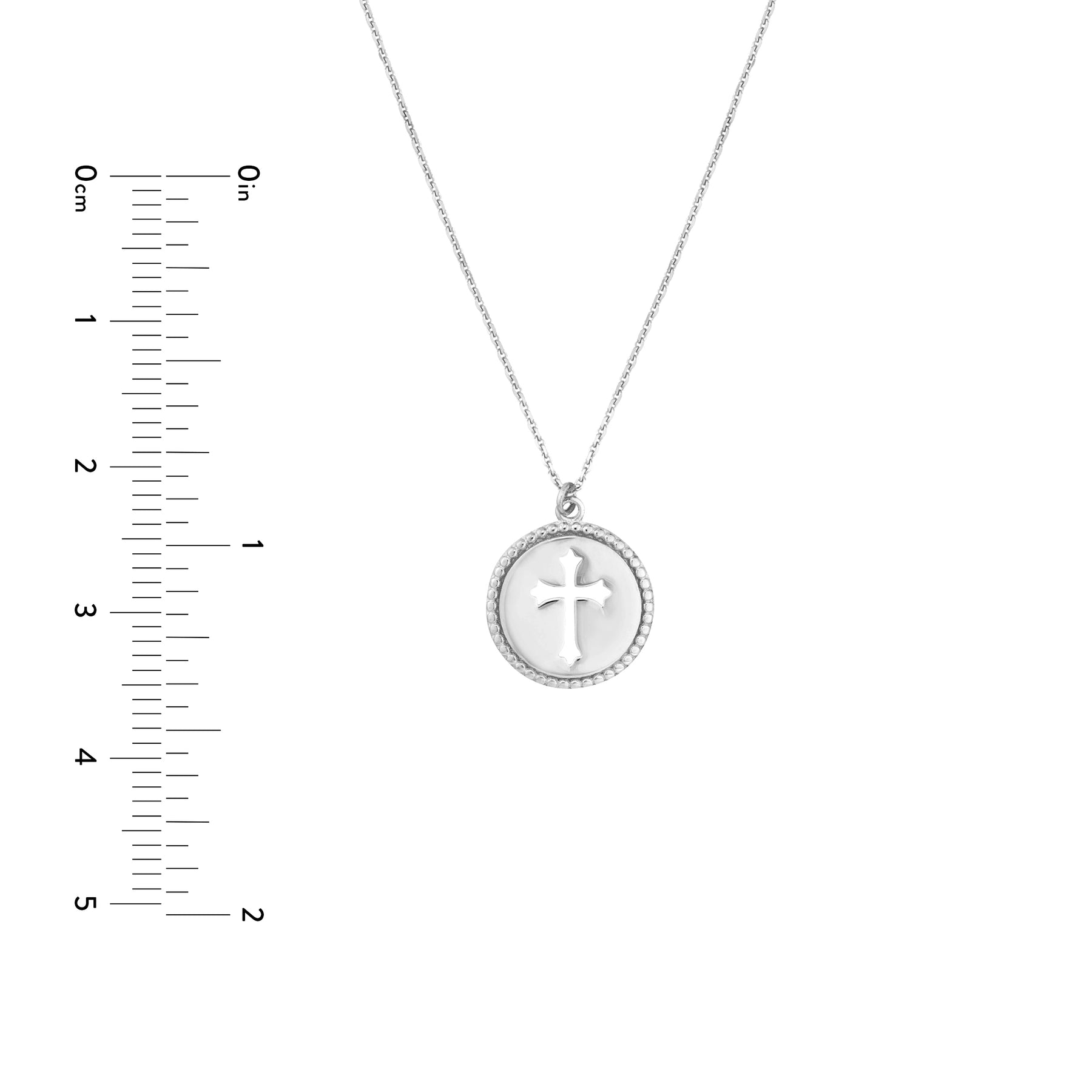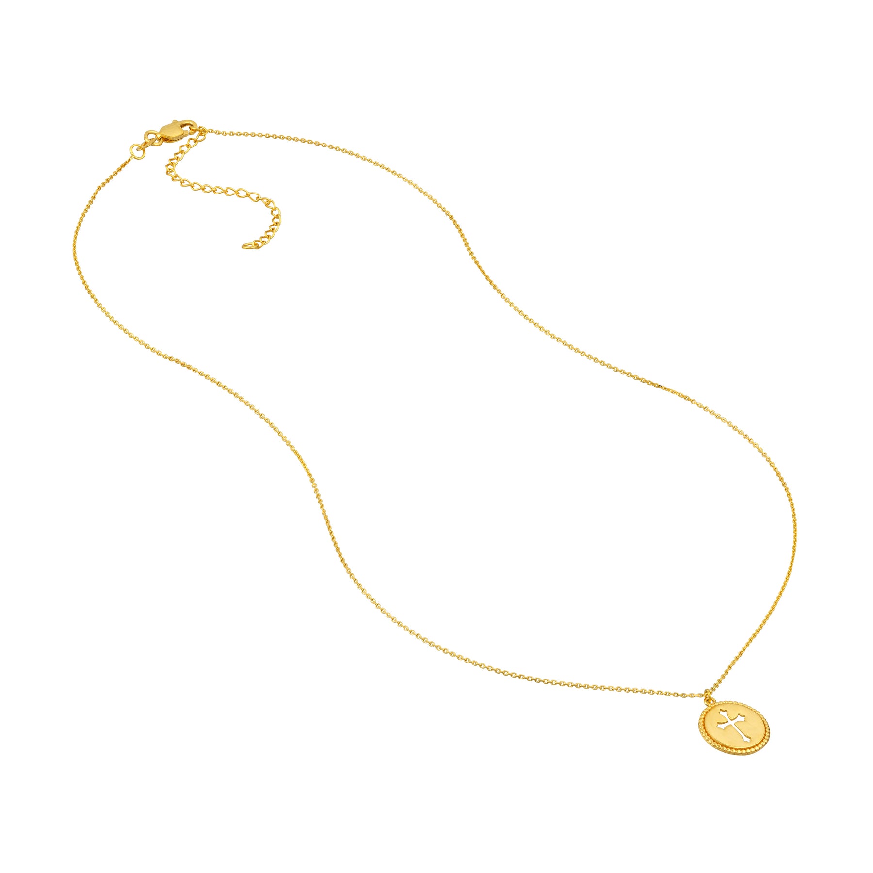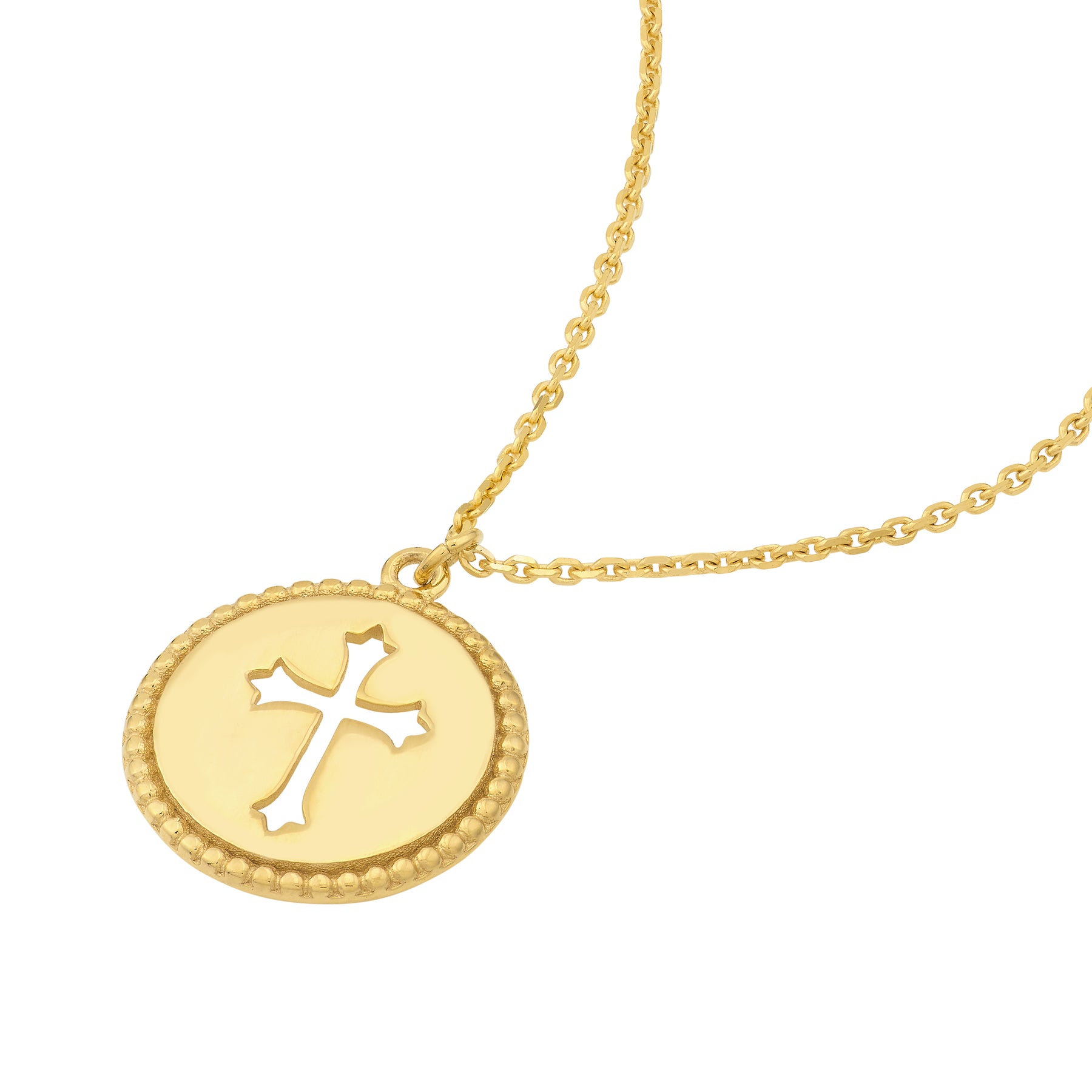 Show off your faith with fashion cross jewelry. This 14K gold bead frame medallion necklace has a graceful cross cutout on a 12mm disc.