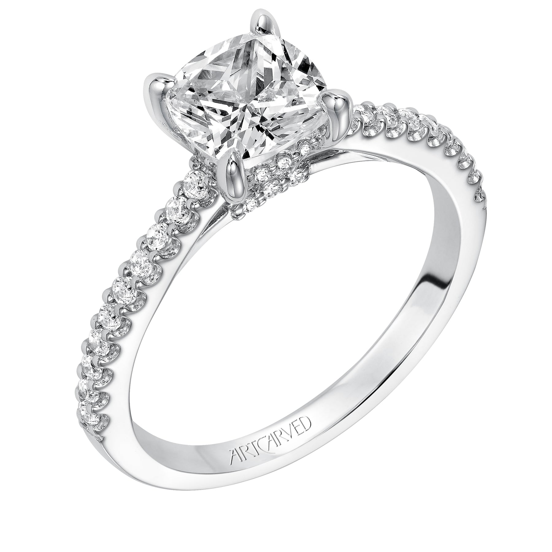 31-V930ERWY-E.01 - ARTCARVED - Lyric Engagement Ring with Cushion Diamond Halo and Accented Diamond Gallery with Diamond Shank