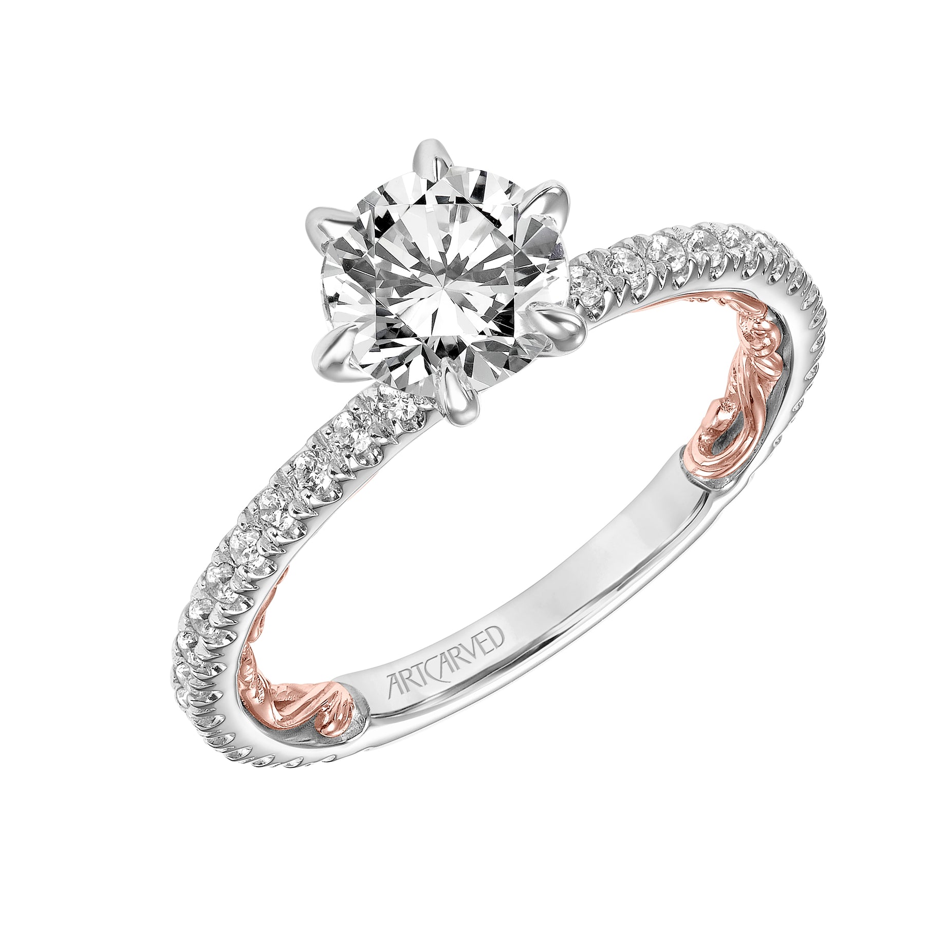 31-V909GRWR-E.01 - ARTCARVED - Lyric Engagement Ring with Six Prong Setting and Inner Carved details and Diamond Shank