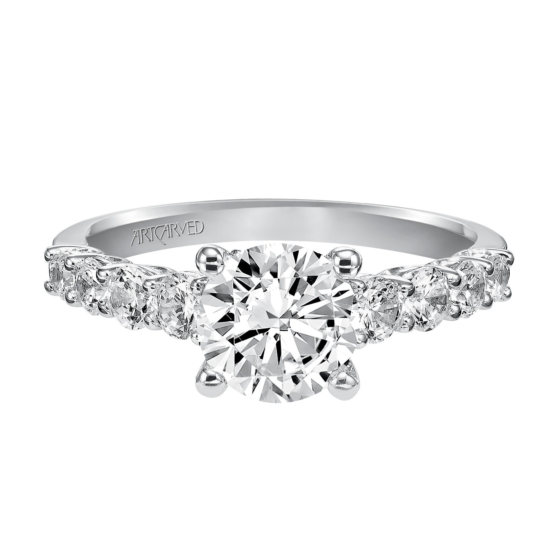 Masterfully crafted, this engagement ring dazzles with its round center stone and prong set diamond band with delicate milgrain and beautiful engraving