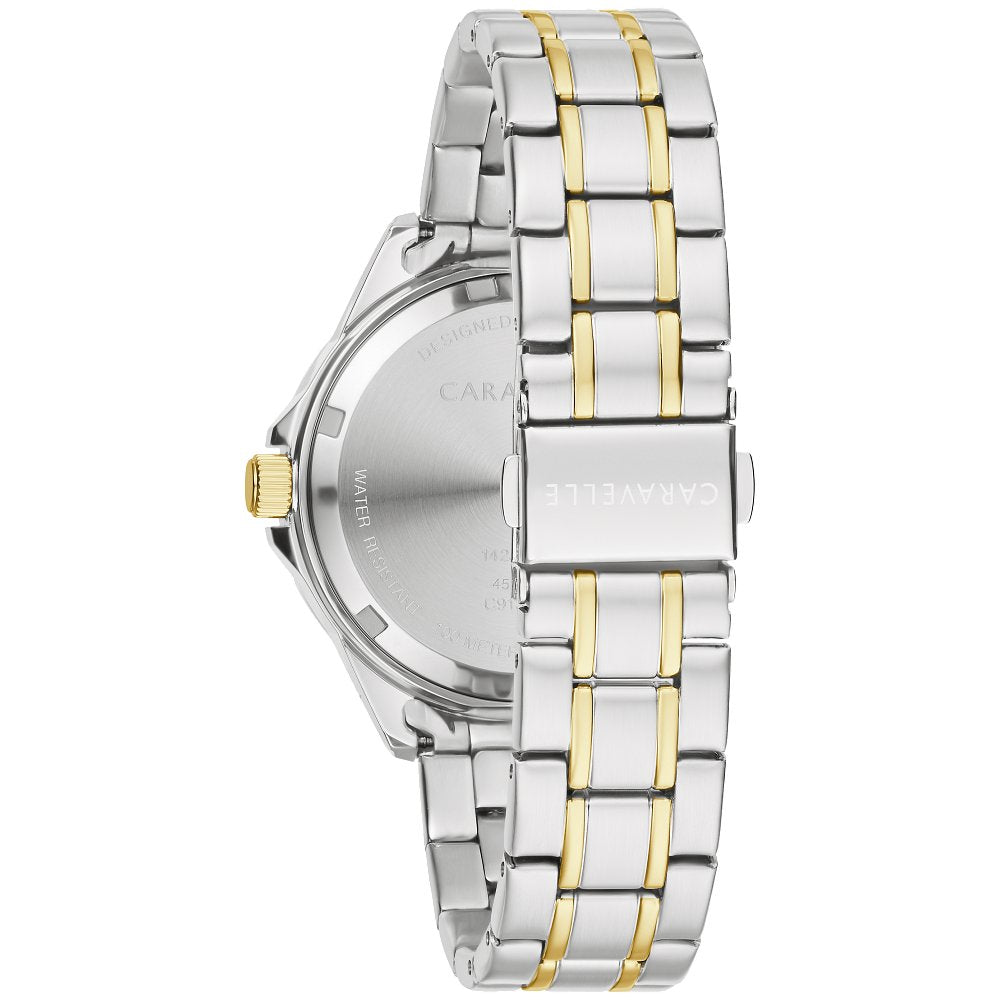 Inspired by Bulova heritage timepieces, the petite two-tone stainless steel Regatta features a lustrous white mother-of-pearl dial set with 11 diamonds. Signature Regatta design details feature the crown at the 2 oclock position and distinct angled lugs. Flat sapphire crystal, slim quartz movement, and water resistance to 30 meters.